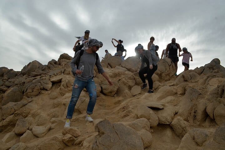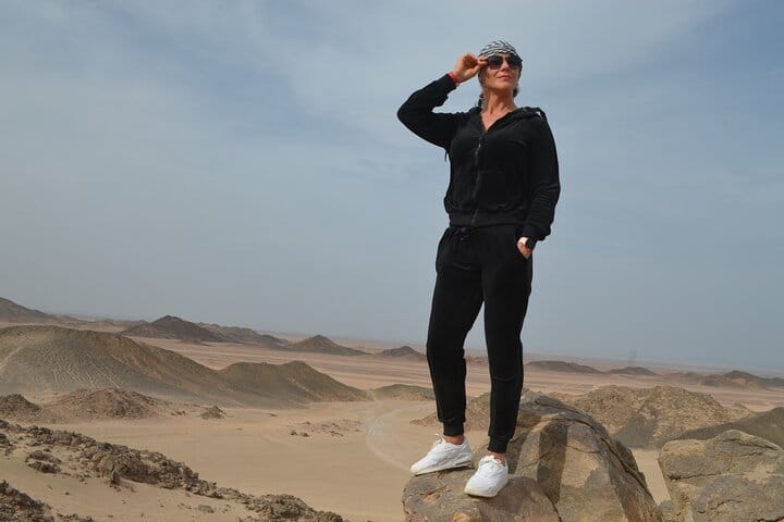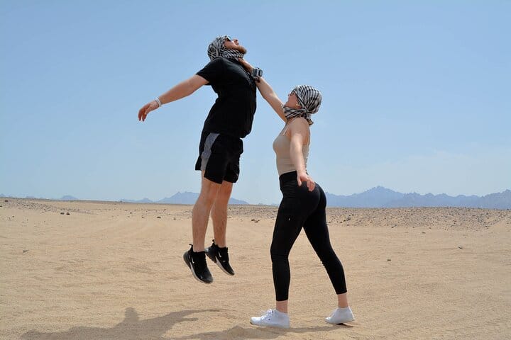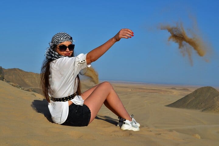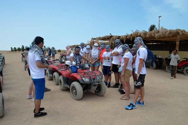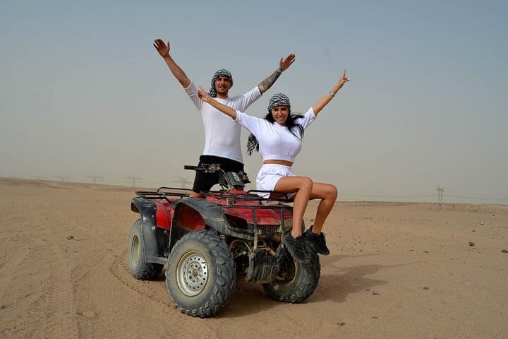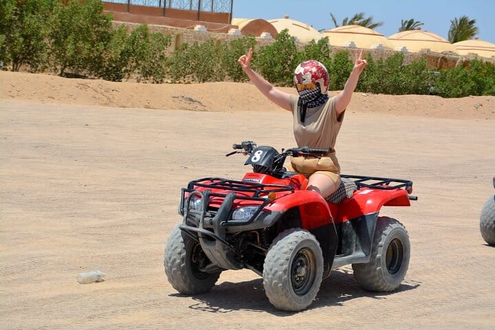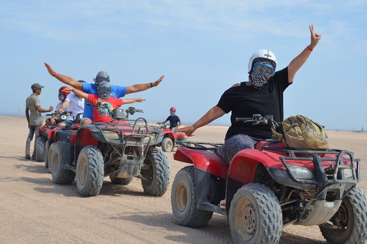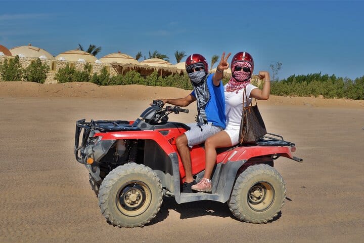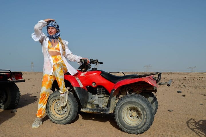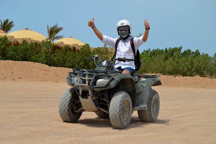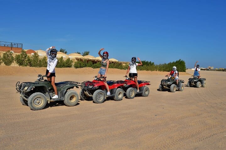 Experience the thrill of a lifetime with a 3-hour desert adventure in Hurghada! Your journey begins with a convenient hotel pickup and a short safety briefing at the quad station. Then, hop on a powerful quad bike and race across the golden sand dunes of the Red Sea desert, feeling the rush of wind and the vast, breathtaking landscape all around you. After an exhilarating ride, arrive at a traditional Bedouin village where you can enjoy refreshing water, authentic Bedouin tea, and try shisha while learning about the local nomadic lifestyle. For a touch of tradition, take a gentle camel ride across the dunes before jumping back on your quad to explore even more desert terrain. Perfectly combining adrenaline, culture, and stunning scenery, this Hurghada desert tour is an unforgettable adventure for thrill-seekers and travelers eager to discover the beauty and heritage of the Egyptian desert.