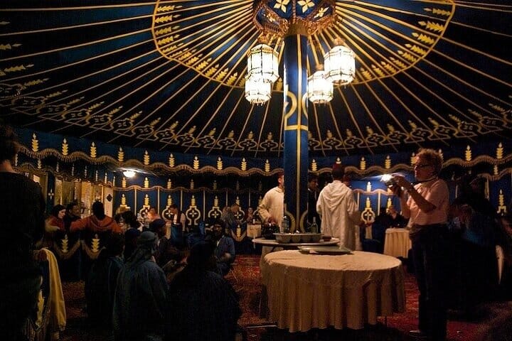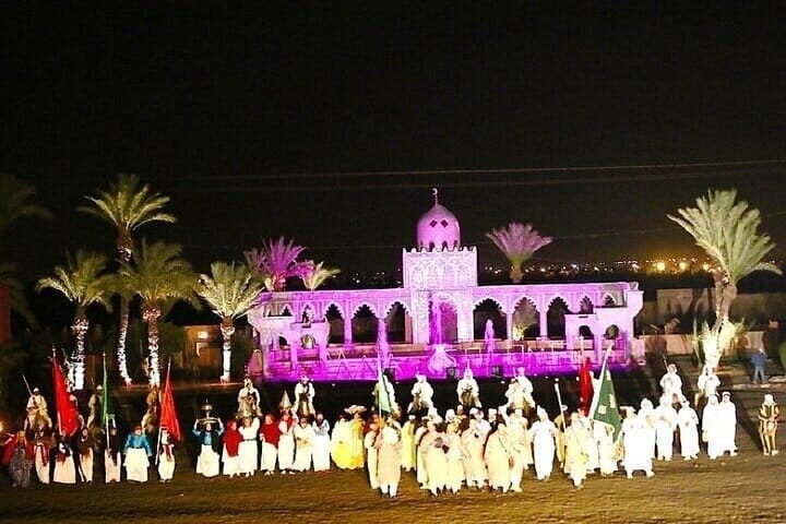 As you dine, the air comes alive with traditional music and folkloric performances, building anticipation for the evening’s highlight – the spectacular Fantasia Show. Watch as skilled horsemen perform thrilling stunts, while dancers, drummers, and musicians bring ancient Moroccan tales to life under a starlit sky. Fireworks, vibrant costumes, and dramatic storytelling create a magical ambiance that will stay with you long after the night ends.