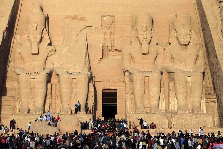 The four statues that guard the entrance leading to the largest of these temples are the largest statues that have survived from the ancient Pharaonic era.