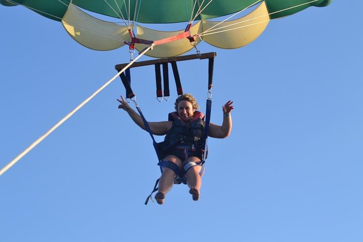Take part in parasailing, a recreational activity where a one or two people are towed behind a boat while attached to a parachute, ascending up to 40-50 meters (about 164 feet) in the air with a full 5-7 minutes flight time.