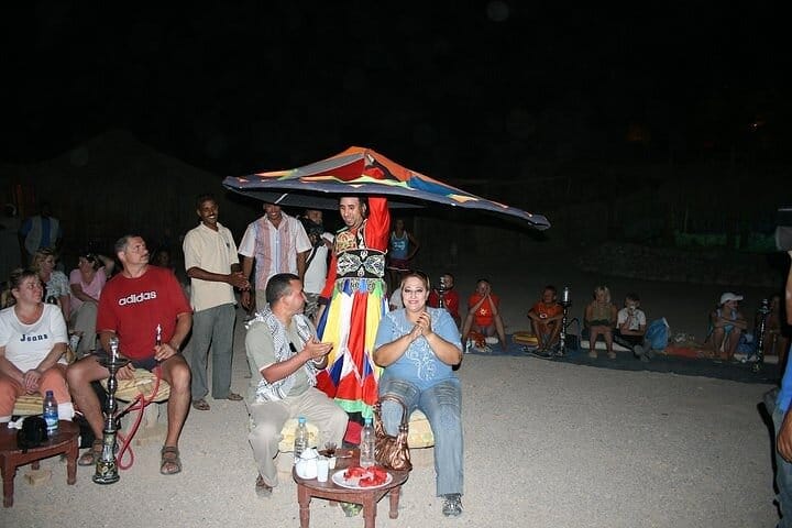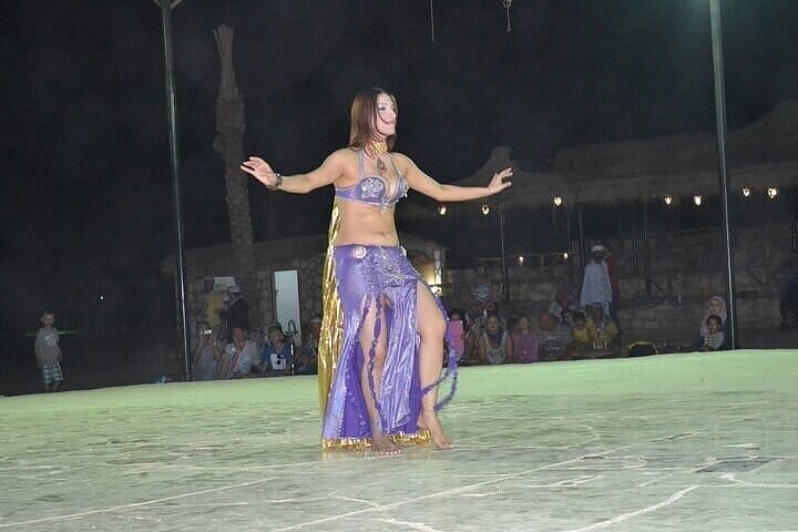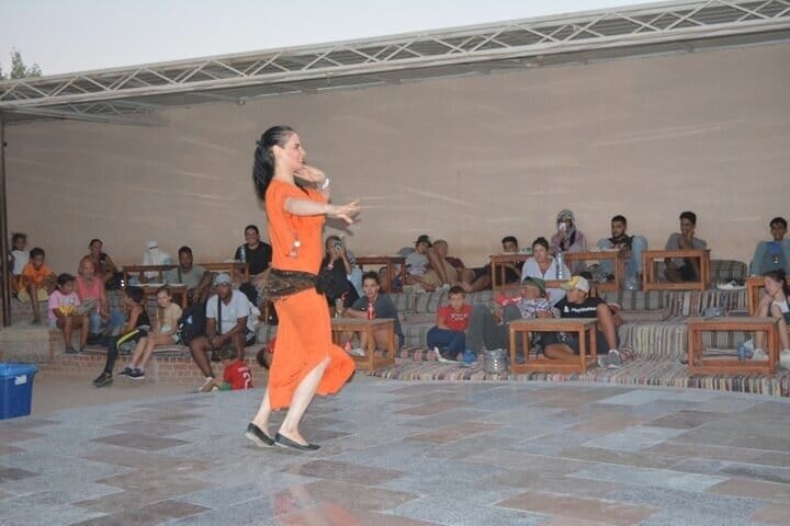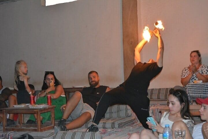 As the sun sets behind the mountains, the desert glows with warm colors, creating the perfect backdrop for an open-buffet Bedouin dinner served under the evening sky. The night ends with a vibrant live show featuring Tanura spinning, belly dancing, daring Fakir performances, and captivating fire displays.
